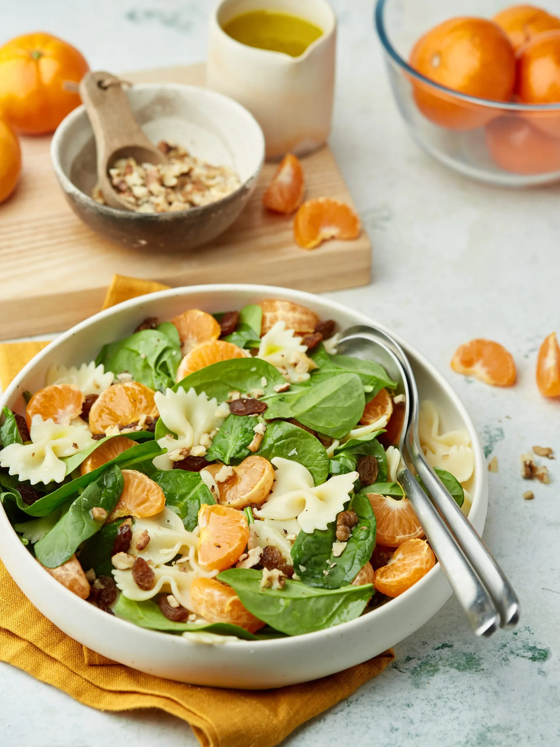 Dans un grand saladier, ajoutez les pâtes refroidies, les raisins secs, les épinards et les oranges. Arrosez la vinaigrette et mélangez. Saupoudrez les noix et servez immédiatement.